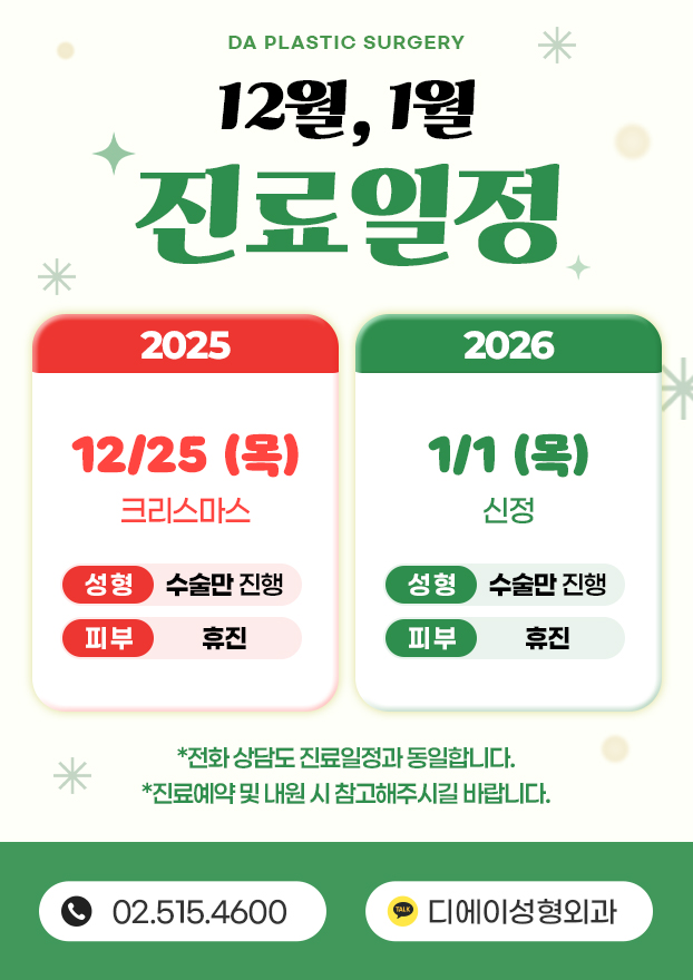 디에이성형외과의원은 회원인증과 관련 암호알고리즘을 이용하여 네트워크 상의 개인정보를 안전하게 전송할 수 있는 인증 및 보안장치를 채택하고 있으며, 시스템상 사정에 의해 미시행시 도우미에 의한 의사 확인을 시행하고 있습니다.