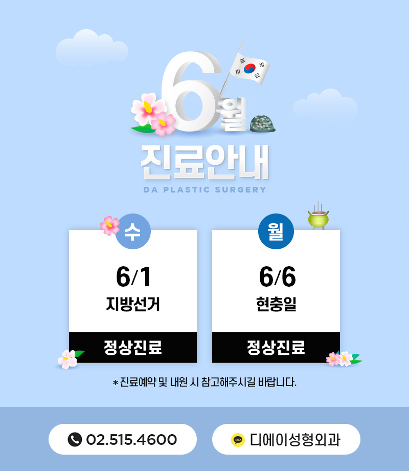 디에이성형외과의원은 회원인증과 관련 암호알고리즘을 이용하여 네트워크 상의 개인정보를 안전하게 전송할 수 있는 인증 및 보안장치를 채택하고 있으며, 시스템상 사정에 의해 미시행시 도우미에 의한 의사 확인을 시행하고 있습니다.